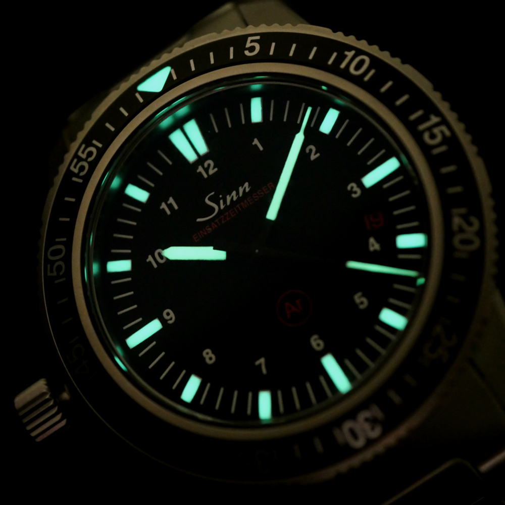 “必要な機能だけを搭載する”というSinn(ジン)の時計作りのモットーに従い、EZM3のダイヤルではダイビングに必要な機能だけに集中するため、一部の文字表示と日付表示を赤色にしています。海中では10mを超えたあたりから赤い光が吸収され海中に届かなくなるため、赤い色が見えにくくなるのです。