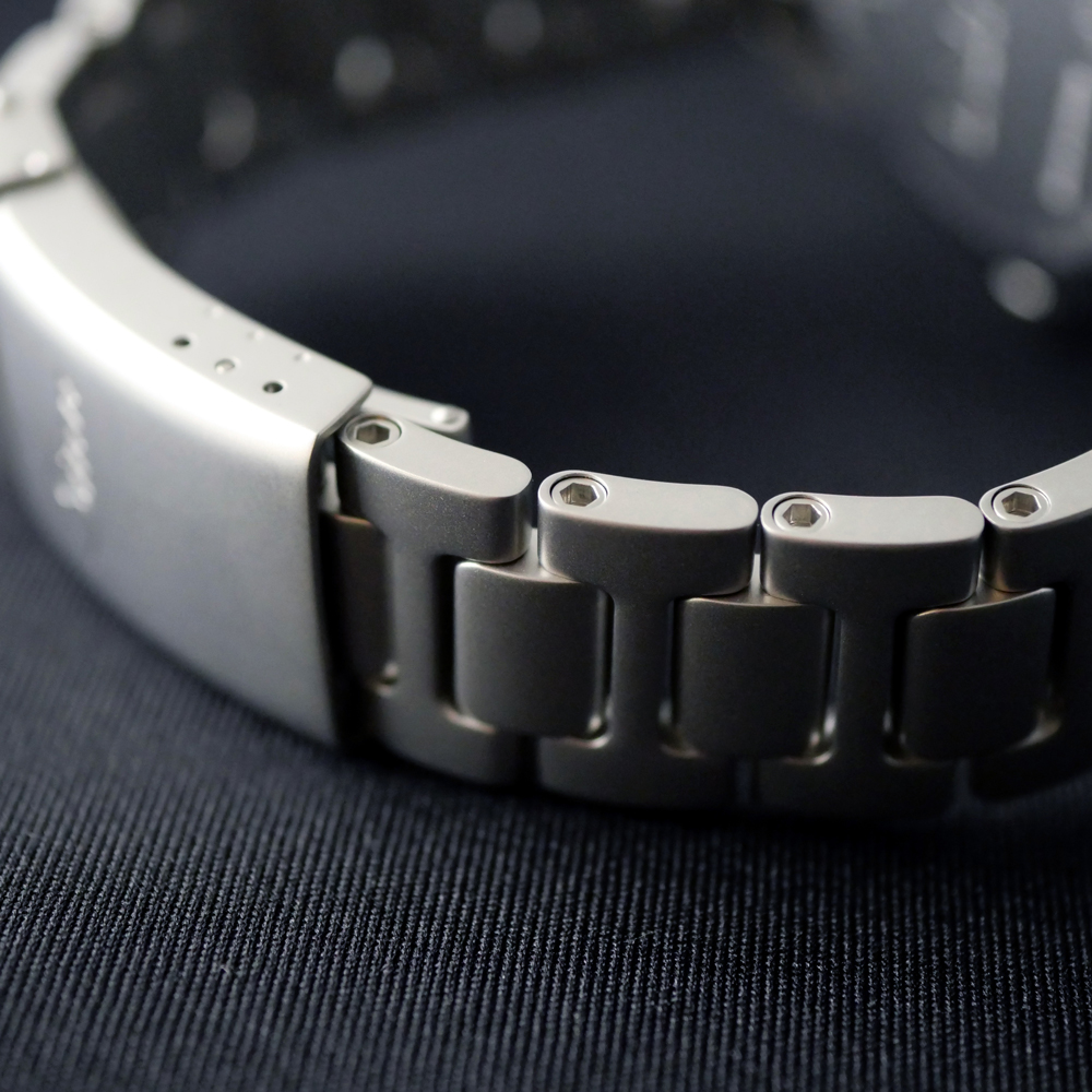 ブレスレットには、ヘキサゴンスクリューと呼ぶ六角形のヘッドが付いたネジを採用しています。両側からレンチによって取り外すため通常の駒ネジに比べ抜けにくく、太さがあり頑丈で、取り付けしやすい仕様です。ブレスレット自体の強度も高い作りです。