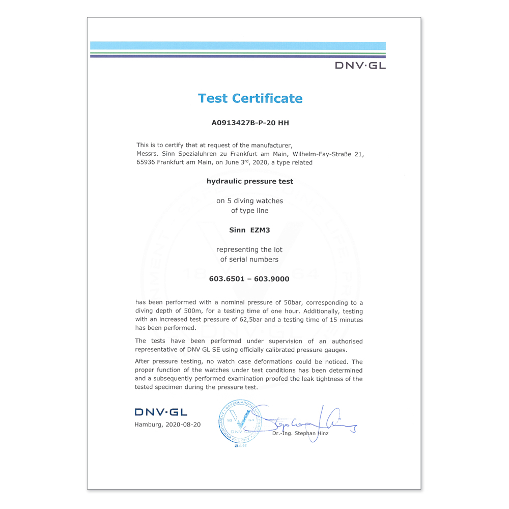 DNVはノルウェー・オスロに本拠地を置く認証機関で、150年以上の歴史を持ち世界100ヵ国以上で活動する国際機関です。2005年からSinn(ジン)の検査・認証を行っていたゲルマニアロイドと合併以降もSinn(ジン)の腕時計の認証を行っています。ミッションタイマーEZM3は500mの防水性能が認証されています。