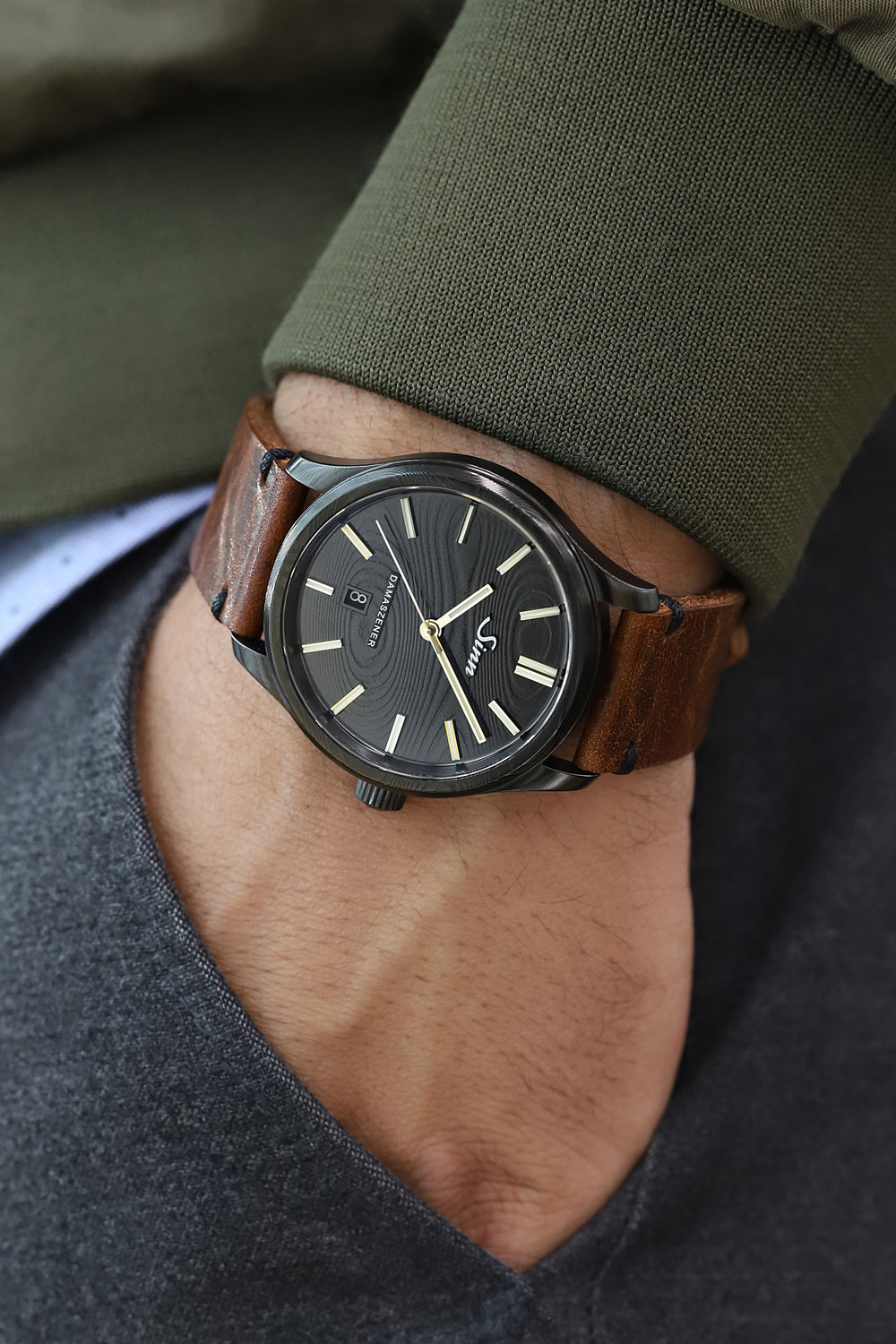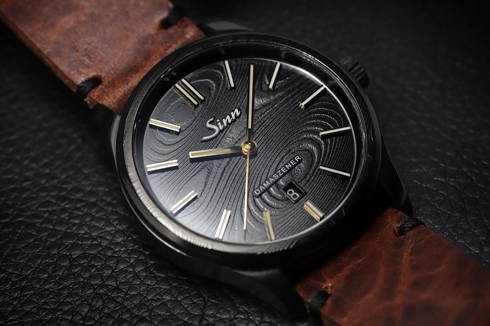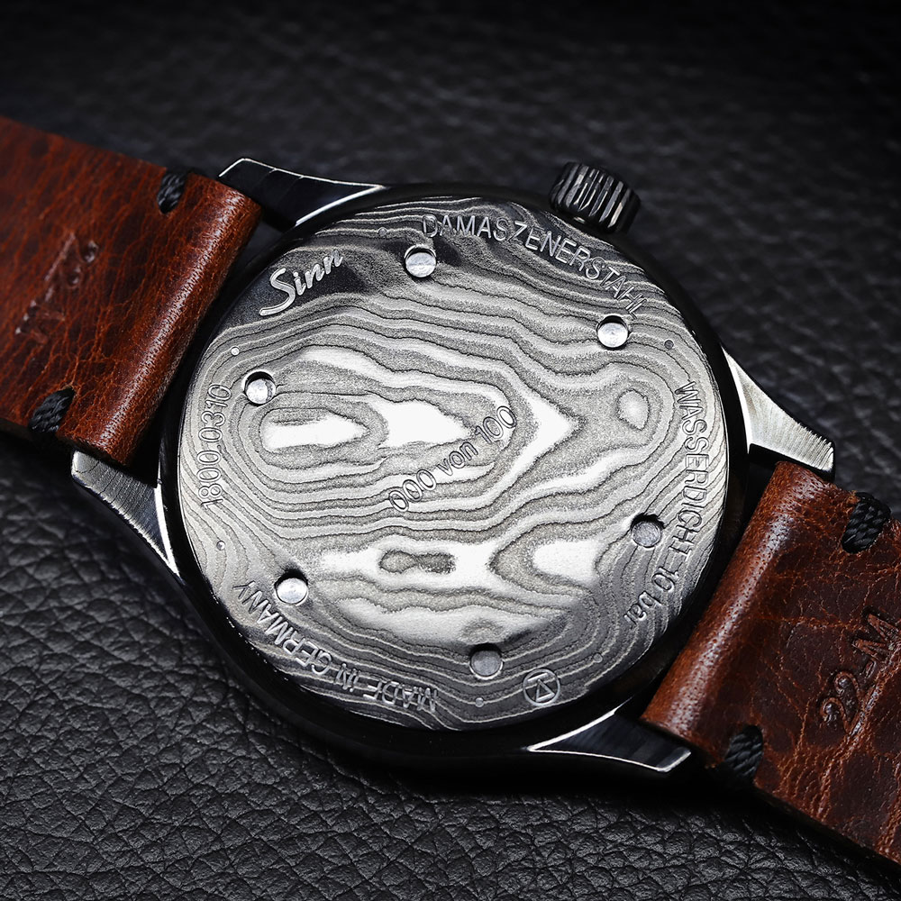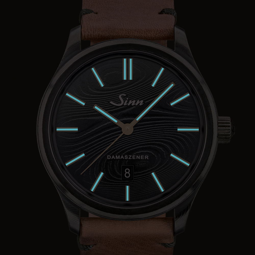 ここで鍛造溶接されたスチールは、ジンのケース工房SUG(ザクセン時計技術社グラスヒュッテ)に送られ、圧延、ウォータージェット、削り出しという工程を経て、1点1点表面模様の異なるケースが生まれます。最終工程で生まれるダマスカス特有のパターンは意図的に生成できないため、ひとつとして同じ模様のケースは存在しません。さらに完全なブロックから作られたケースとダイヤルはダマスカス模様が途切れることなく続き、独特で趣のある外観を形成しています。