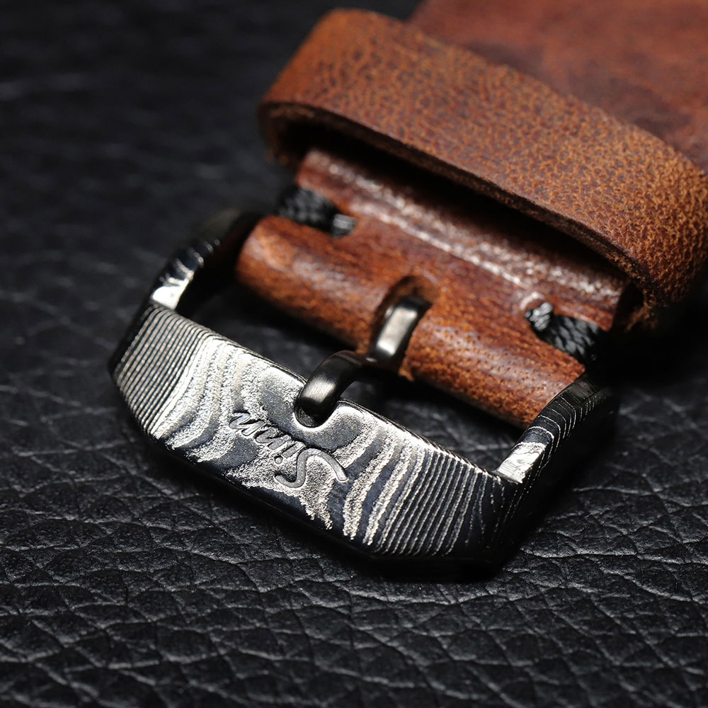 1800.S.GG.DAMASZENERでは、リューズ、尾錠、裏蓋にもケース同様にダマスカス模様の積層鋼材を使用しています。ケースを含むこれらのパーツはテギメント加工とブラックPVDによるブラック・ハード・コーティングで、セラミックスと同等にまで耐傷性が高められています。