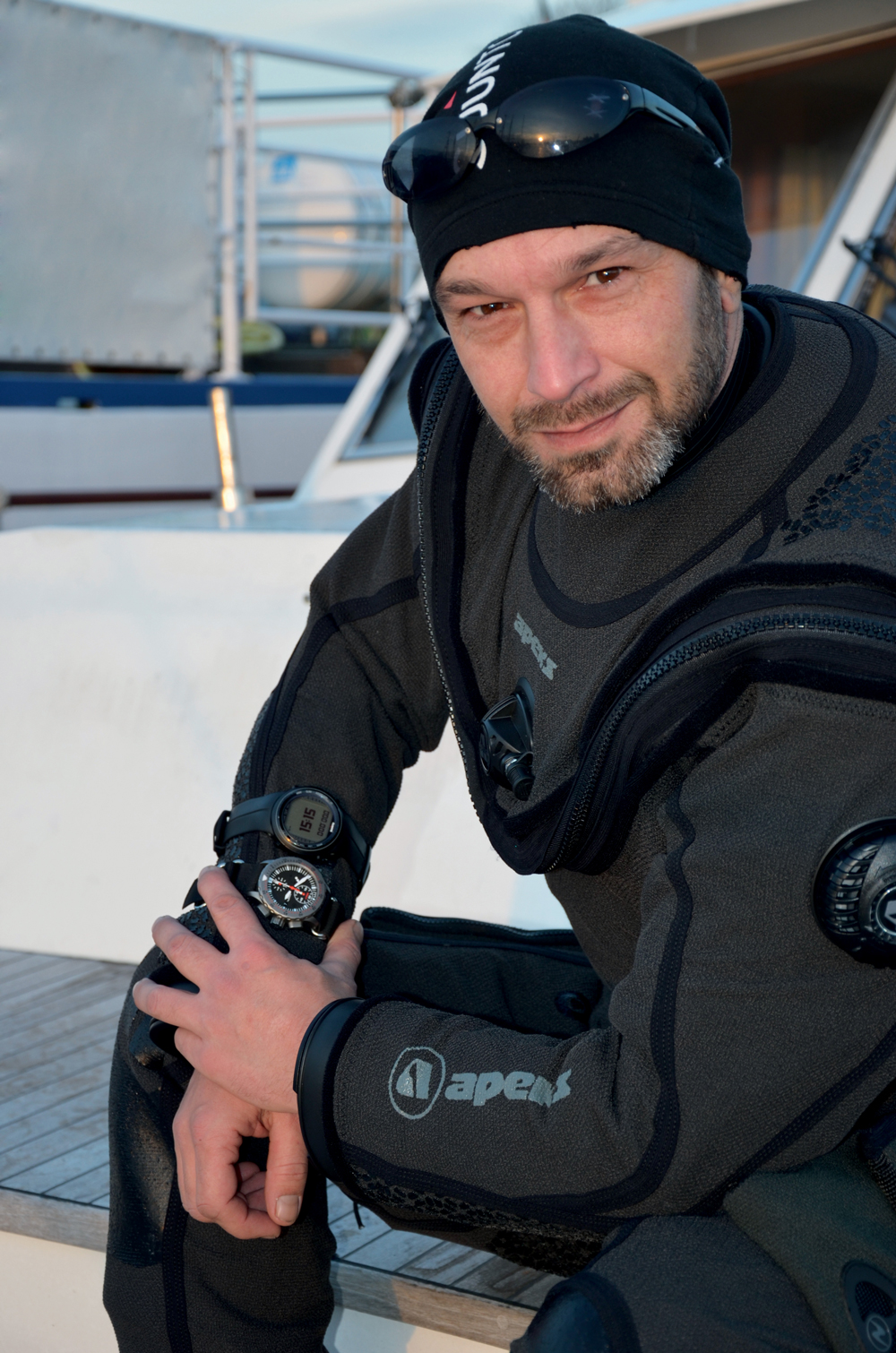 まるで探偵のようにして記憶と対峙するだけではなく、守らなくてはいけないことがあります。テクニカルダイビングはスキューバダイビングの中でも究極のバリエーションで、ここではアンドレアス・ペータースのようなプロが、スポーツダイバーが行かないようなところにまで進んでいきます。テクニカルダイビングは難易度が高く、もっと危険で、失敗が許される範囲も非常に狭いのです。リスクを軽減するために、ふさわしい装備設定を施した特殊ダイビング装備が必要となりますが、場所や海に関する知識、豊かな経験、完璧な準備も求められます。アンドレアス・ペータースはとりわけ、 生死にかかわる装備を重複して持つことを重視します。U1000はここで非常に重要な役割を担います。「私は最新のダイビング用コンピューターを使用してはいるものの、この特殊領域を軽んじてはいけないので、U1000などの追加的安全システム無しで潜水することは決してありません。ダイビング用コンピューターのバッテリーが切れることもありますし、処理のエラーもありえます。機械式クロノグラフであるU1000ではこうしたことは起こりません。この時計は私にとって追加のダイビング装備です。100%信頼しています」